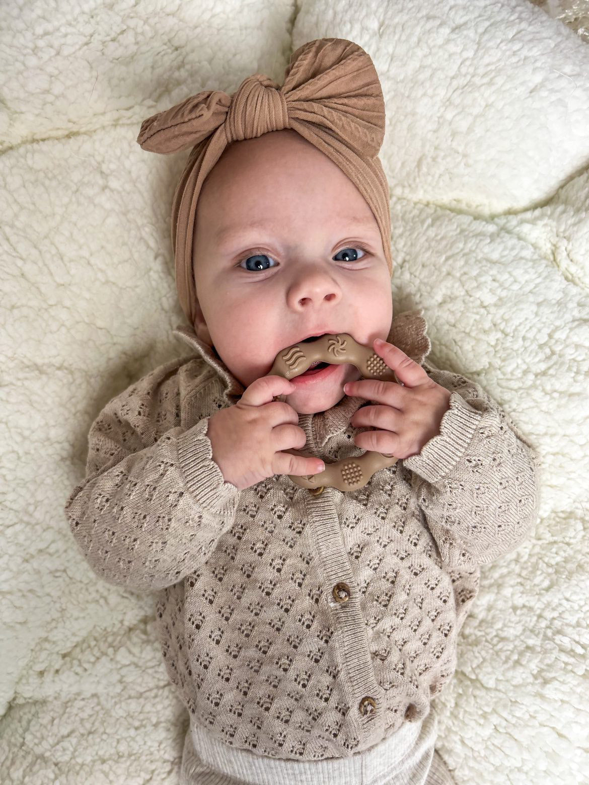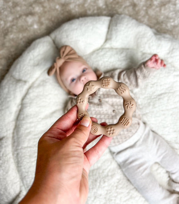 In ons assortiment zijn er verschillende bijtringen te koop. Er zijn zowel siliconen als houten bijtringen te vinden in onze shop. Al onze bijtringen zijn verantwoord. Deze siliconen bijtring is gemaakt van 100% baby veilig materiaal. Deze bijtringen bevatten tot maar liefst 7 verschillende bijtstructuren. Het masseert het pijnlijke tandvlees en kunnen ook nog gekoeld worden in de koelkast. De bijtringen zijn maximaal 50 gram waardoor ze makkelijk vast te houden zijn voor jou kleintje.
